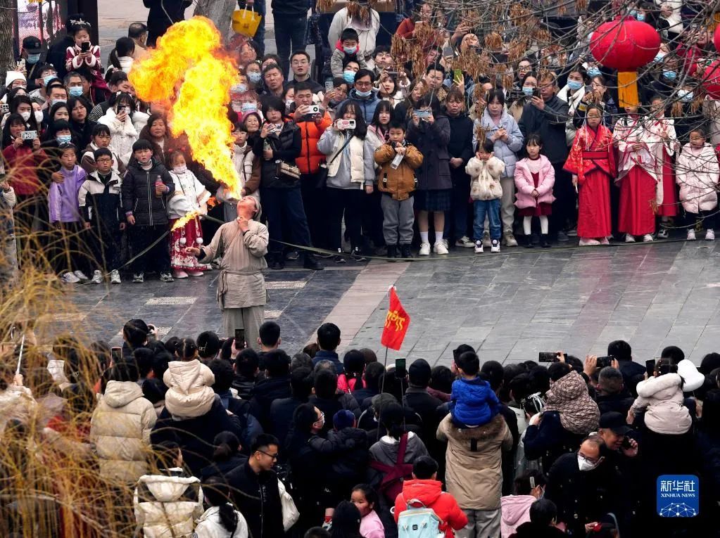 遊客在開(kāi)封清明(míng)上(shàng)河(hé)園景區(qū)內(nèi)觀看(kàn)民(mín)俗♠表演(2月(yuè)14日(rì)攝)。