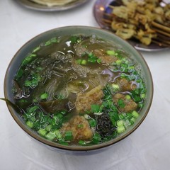 連湯肉片。湯中料十分(fēn)豐富,毛豆、黑(hēi)木(mù)耳、平菇、西(xī)紅(hóng)柿、肉片、蒜苗,一(yī)勺下(xià)去(qù),滿>滿都(dōu)是(shì)料,小(xiǎo)碗18元,加入了(le)澱粉勾芡,湯汁濃稠,加入白(bái)胡椒,味道(dào)鹹辣。