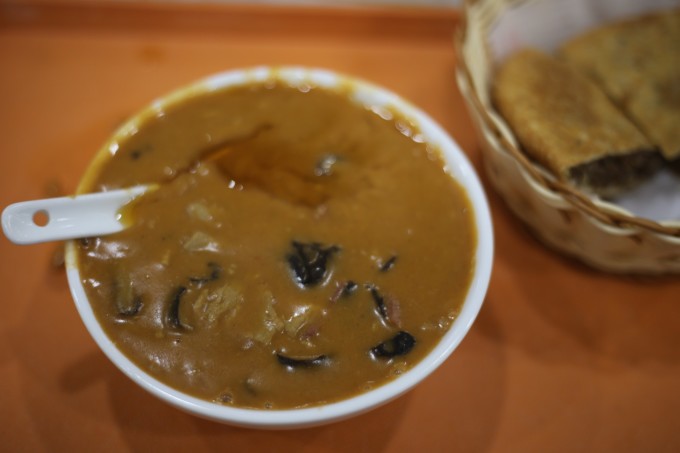 主食可(kě)以選擇餅絲或是(shì)鍋盔,餅絲塞入湯中,吸收了(le)湯汁,變得(de)綿軟。